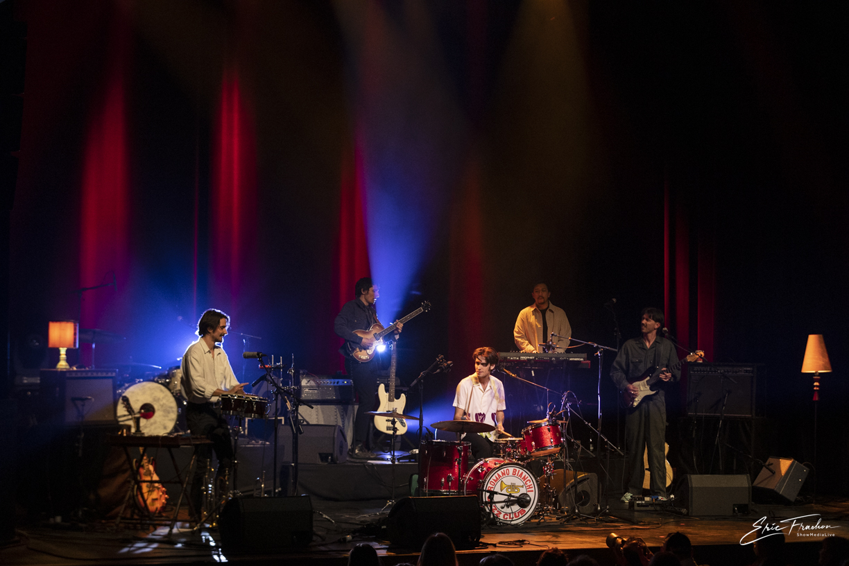 Nous commençons la soirée avec Romano Bianchi, chanteur-guitariste genevois. Il est aussi batteur, ce qui n’est pas rare de voir. Après plusieurs aventures en groupe, il se lance avec son premier album ‘Fringale’ en solo, dans lequel il a glissé son goût des mots et sa passion de la pop des années 60, avec une sonorité psychédélique. Le chanteur est accompagné. Ils sont cinq au total sur scène, et nous accueillent avec de petites lampes comme si on était dans leur salon. Nous allons pouvoir découvrir un artiste qui a choisi de commenter, en français, ses névroses sous forme d’ironie, et d’un parlé-chanté très imagé. Il n’est pour le moment pas très connu, mais c’est l’occasion pour lui avec ces festivals, que l’on attend chaque année, qu’il va pouvoir se faire connaître du public. Le concert a duré une trentaine de minute dans une ambiance très intimiste, calme et reposante.