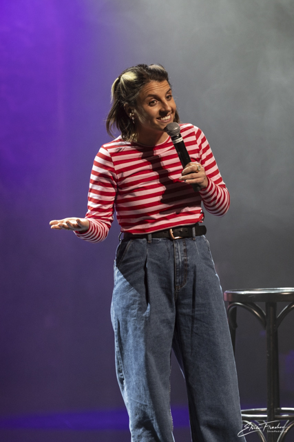 Elle a démarré en 2019 dans l’improvisation et profite de rentrer dans le FIG (fédération d’improvisation genevoise). Et c’est seulement depuis l’année passée, grâce à l’improvisation théâtrale, qu’elle arpente les scènes de stand-up de Suisse romande. D’une formation d’ingénieur agronome, elle blague autant sur le profile psy de son père, que de l’agriculture suisse. Par contre, son franc-parler lui est inspiré par des humoristes féminins, comme Swann Périssé ou Nicole Ferroni.