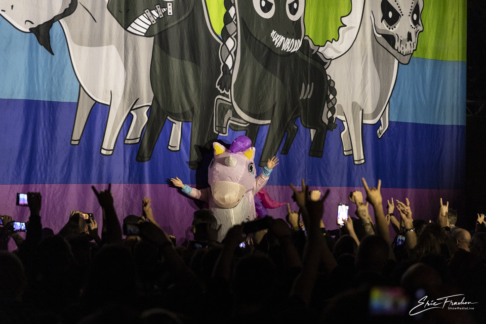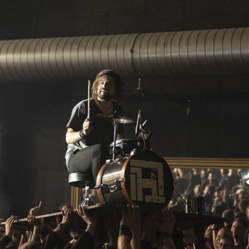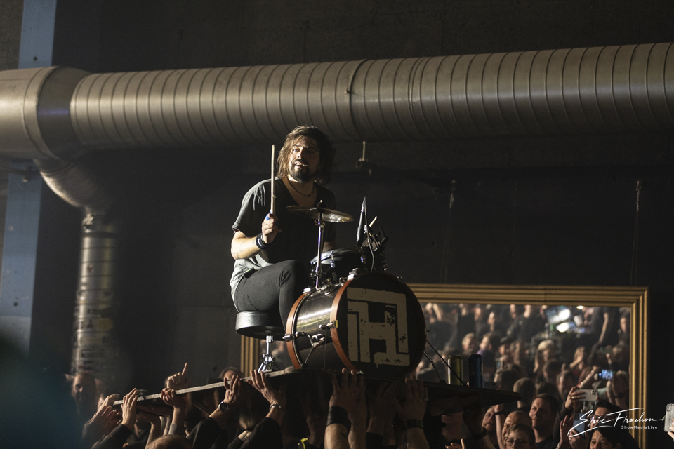 Et voilà, le groupe que tout le monde attend et qui va finir cette belle soirée en apothéose, HäMATOM, qui est une grande et très belle découverte pour nous, et nous en sommes devenus fan. En concert c’est une vraie tuerie, de la pyrotechnique, de l’émotion avec l’hommage pour le membre disparu du groupe, à qui le dernier album lui est consacré. Avec le batteur qui joue sur un petit plateau et qui se fait promener par le public, et par-dessus le public en faisant le tour de la salle, puis ensuite le chanteur fait de même dans un canot de sauvetage, après avoir chanté sur la petite scène au font de la salle du Z7, c’est un grand moment de spectacle absolu. Un concert vraiment magique avec une ambiance de fou, merci pour cette très belle soirée au Z7.