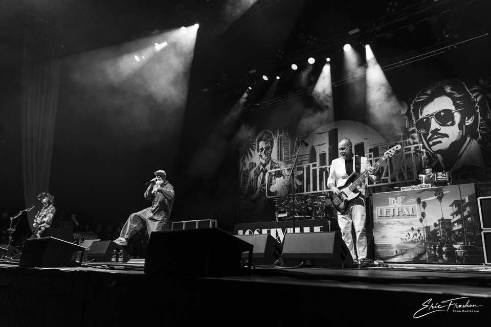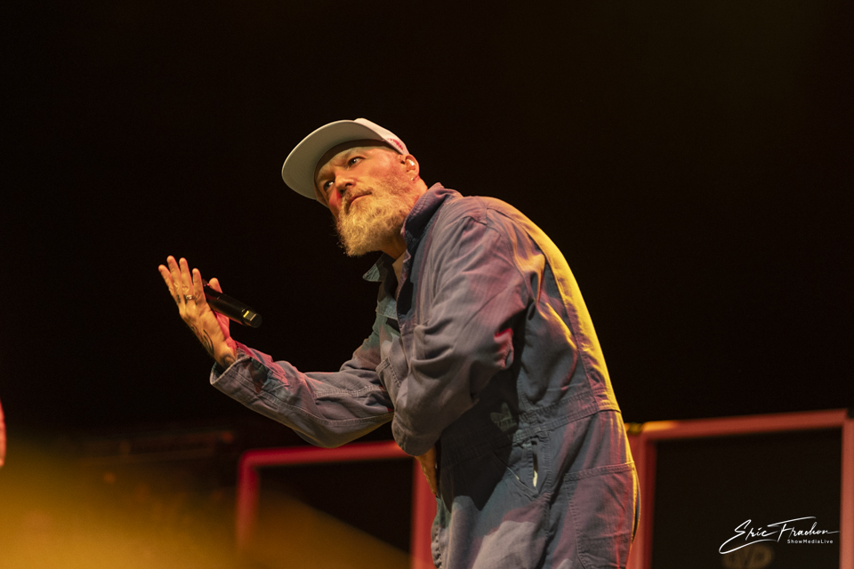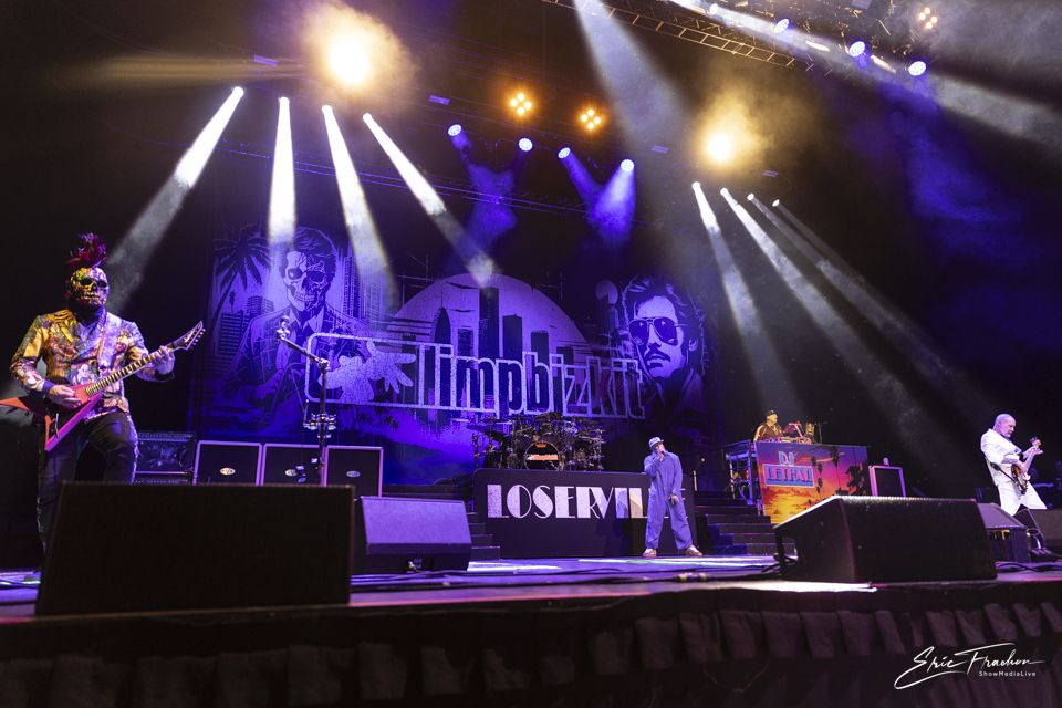 Ça y est, on y arrive à la tête d’affiche. Les premiers rangs, collés à la barrière, sont là depuis 17 :30 et attende ce moment avec impatience. Voici enfin le mythique groupe qui va clôturer cette soirée, je veux parler bien sûr de LIMP BIZKIT avec sa tournée LOSERVILLE. Un show d’environs 1h10, et les fans n’ont pas été déçus. LIMP BIZKIT c’est cinq membres, 7 albums studios, 3 albums de compilations, 1 album live. Le groupe tourne depuis 1994 et ont fait une pause en 2006, mais en 2009, il repart sillonner les routes du monde. Maintenant, le rappeur est là pour ouvrir le show, et les membres du groupe arrivent aussi, ils sont cinq sur scène. Le chanteur habillé d’une salopette, fait les 100 pas sur toute la longueur de la scène, le batteur est difficile à voir derrière ces futs, le DJ à fond derrière ses platines, le bassiste bien habillé tout en blanc et le guitariste ave un masque de tête de mort et très coloré. Ils ont de magnifique costume de scène. A chaque fois, il nous épate avec leur déguisement, si on peut les appeler comme cela. En tout cas, l’ambiance est là. Ils posent aussi pour nous les photographes et le public est en folie. Quel show, même si le site ne dure qu’une heure dix, c’est intense et la soirée est vraiment merveilleuse, avec un fini en apothéose.