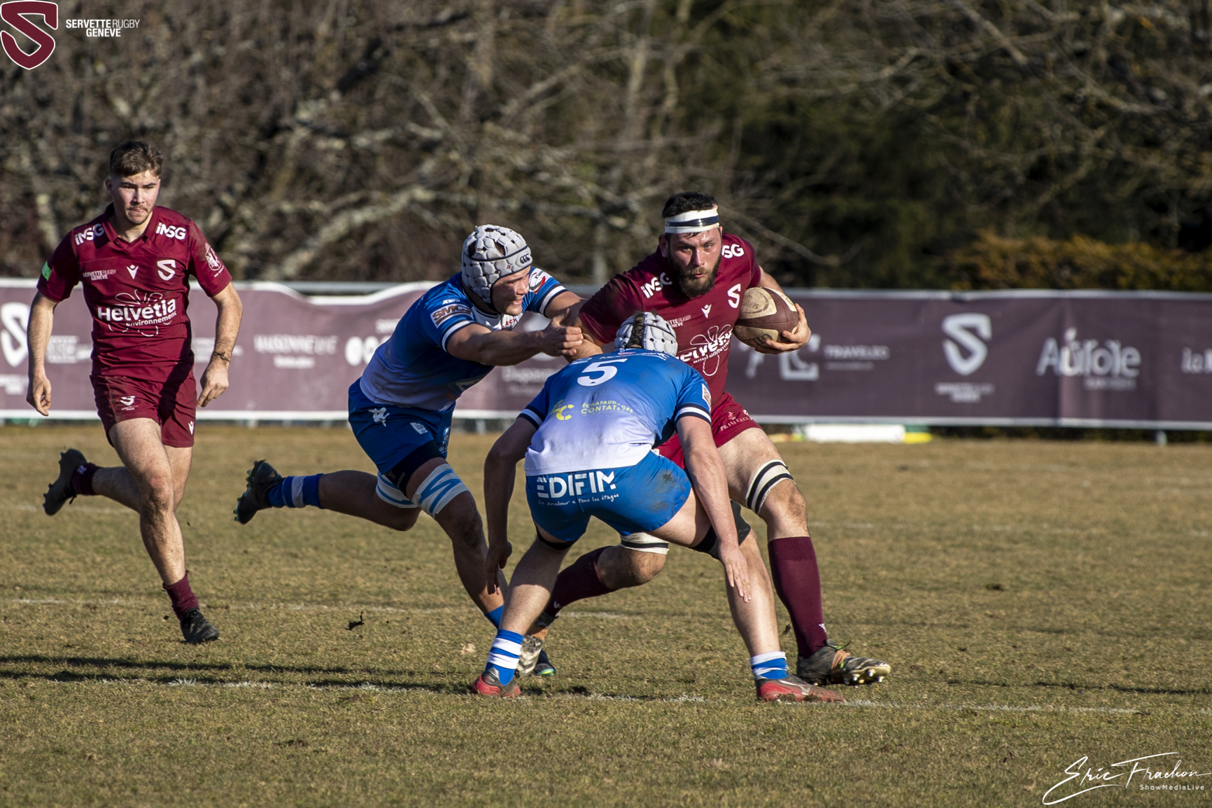 Ce match est un derby, un derby de taille car au classement Annecy ont deux matchs de retard avec celui-ci et ils sont premiers avec le même nombre de points. En plus les supporters des deux équipes se sont déplacés et sont venus en nombre. Pour cette belle journée de rugby, on nous annonce environ 2000 personnes, une fanfare, une organisation au top pour ce grand match. Merci au Servette pour toute cette mise en place. Allez le coup d’envoi va être donné et les Servettiens peuvent passer premier du classement. Le match est rude, les actions sont vite stoppées et il faut attendre la demi-heure de jeu pour voir les premiers points inscrits par Annecy. Le score ne bouge pas vite mais les choses et les contacts sont bien présents. Toutes les actions sont vite avortées, le match est cadenassé et on se retrouve à la mi-temps avec un score de 7 à 6. Nous espérons que la deuxième période sera plus propice aux essais ce qui donnerait de l’espace à ce jeu qui reste enfermé. Malheureusement c’est Annecy qui trouve des failles et qui arrive à inscrire deux essais. Servette n’arrive pas à vaincre ce mur de défense, un essai pour le Servette donnera de la voix mais ce ne fût pas le cas, malheureusement, concède la défaite sur son terrain, avec un score de 16 à 21. Le match retour va être super intéressant. Le Servette avec l’envie de vengeance et Annecy chez eux devant leur public.