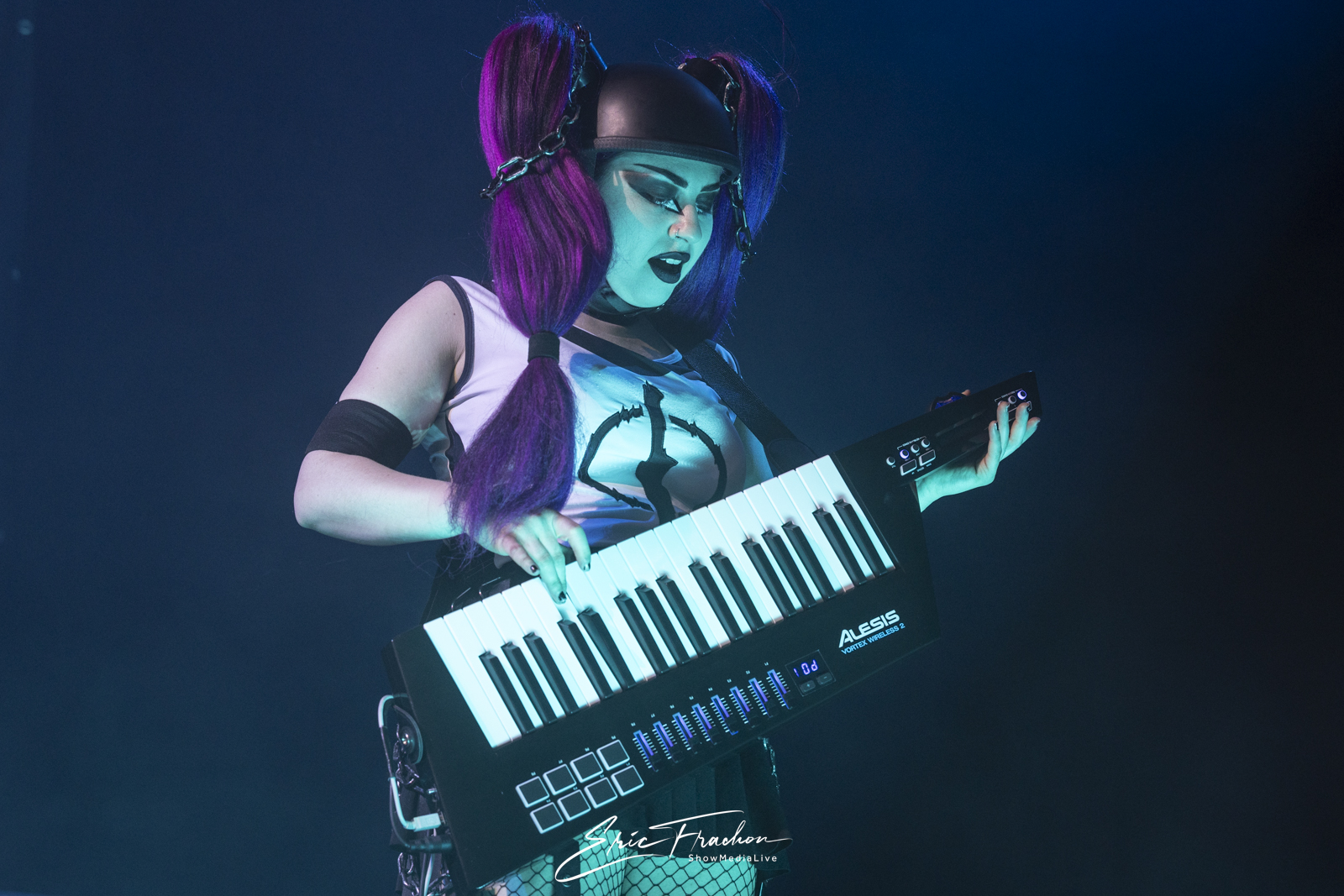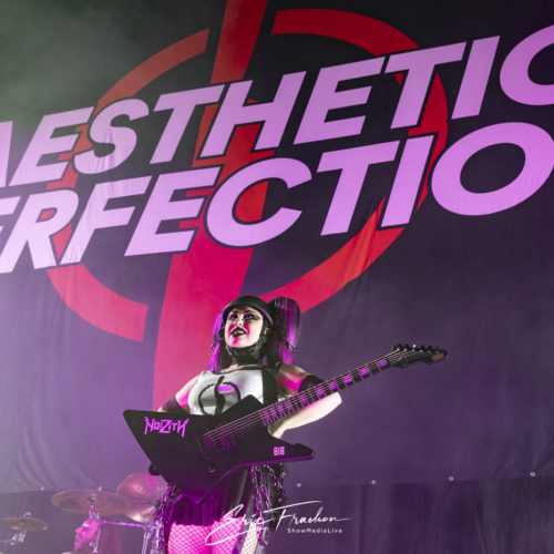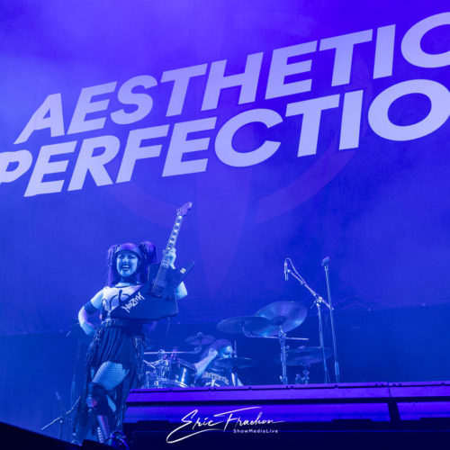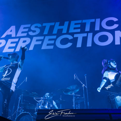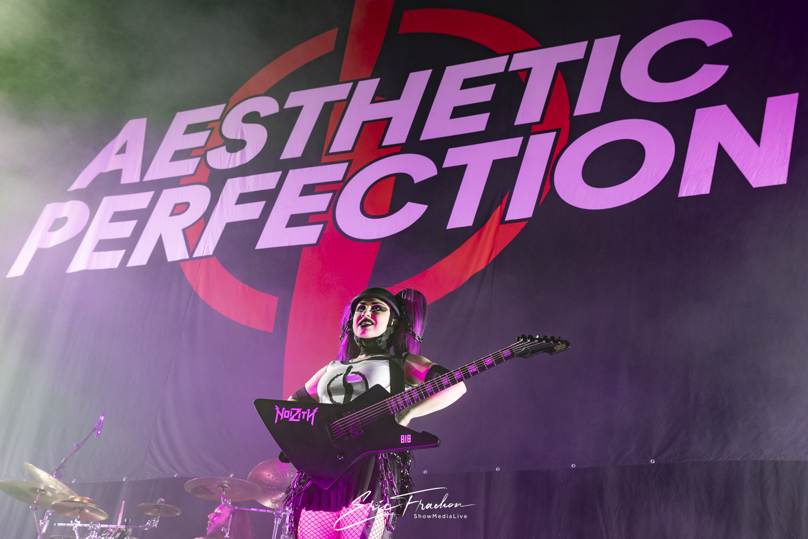 Sur scène, ils sont quatre : deux musiciennes, un batteur et un chanteur. Une formation compacte mais redoutablement efficace. Dès les premières minutes, Aesthetic Perfection s’empare de la scène et capte l’attention du public. Beats martiaux, sonorités électro-industrielles percutantes, attitude frontale : la salle réagit instantanément.