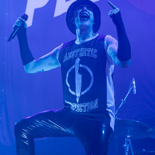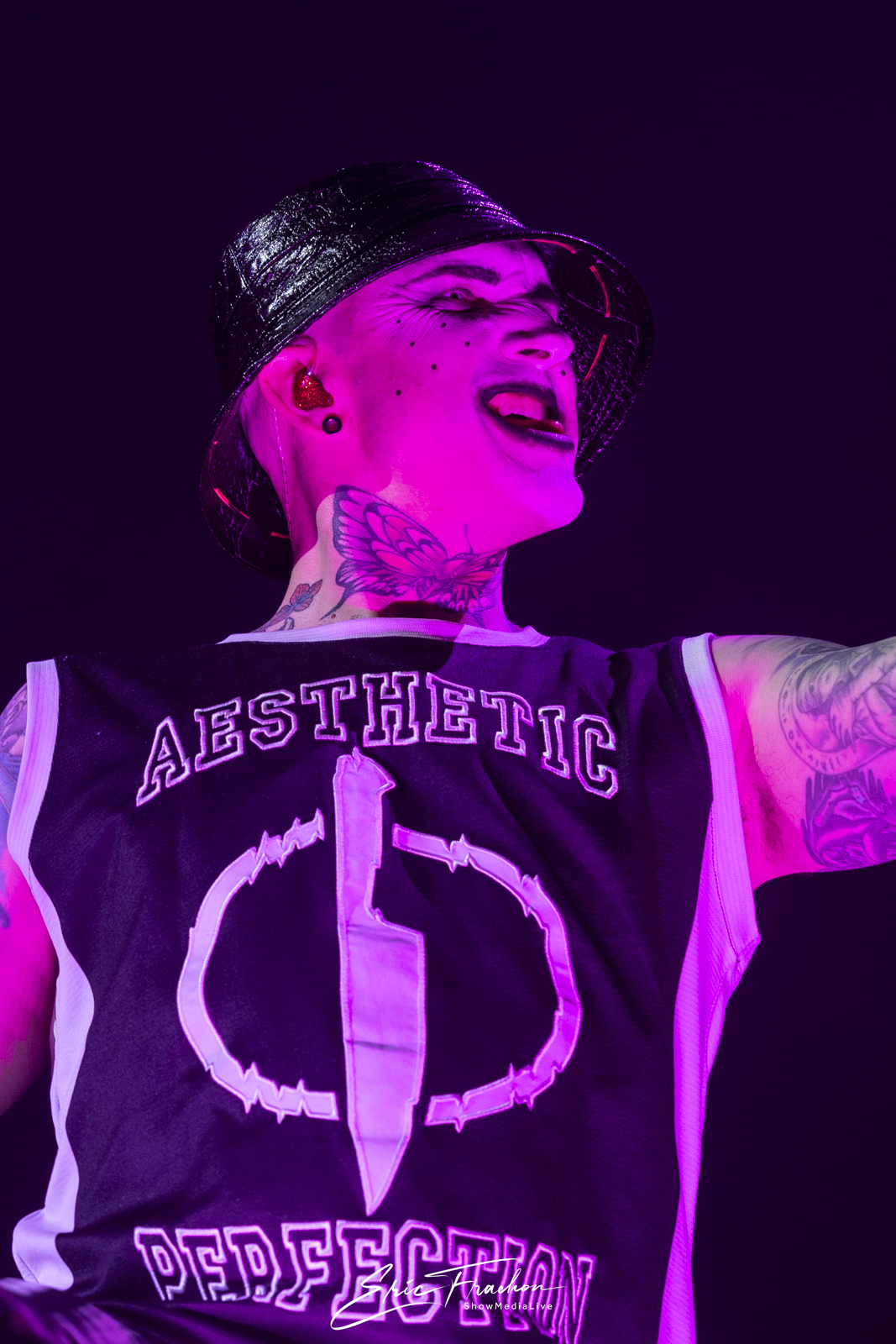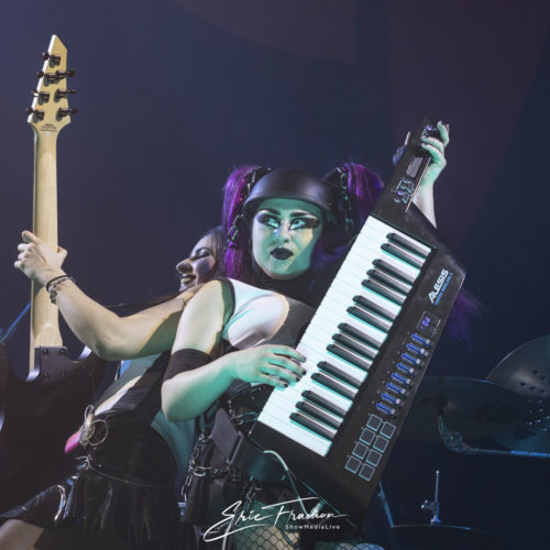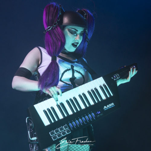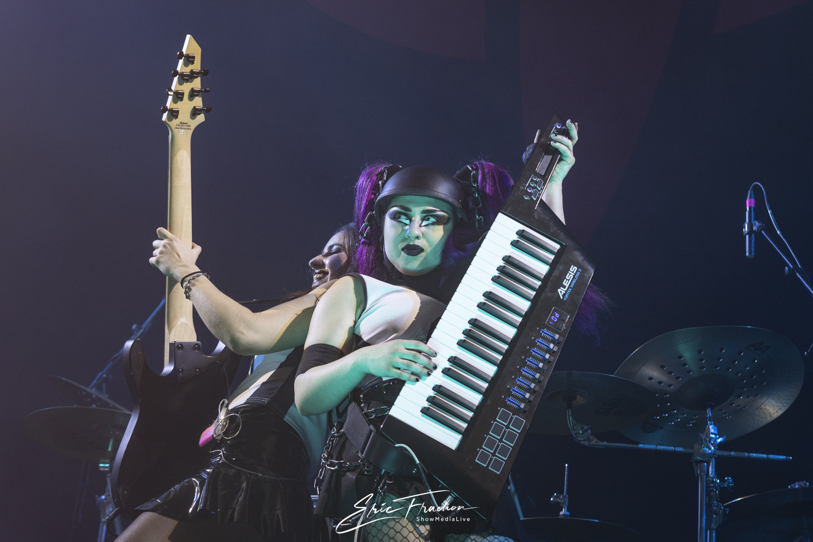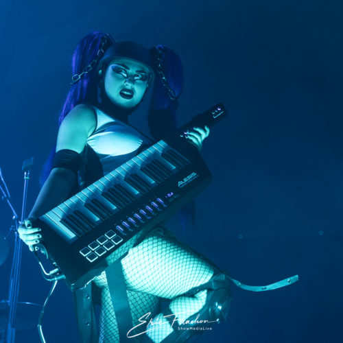 Sur scène, ils sont quatre : deux musiciennes, un batteur et un chanteur. Une formation compacte mais redoutablement efficace. Dès les premières minutes, Aesthetic Perfection s’empare de la scène et capte l’attention du public. Beats martiaux, sonorités électro-industrielles percutantes, attitude frontale : la salle réagit instantanément.