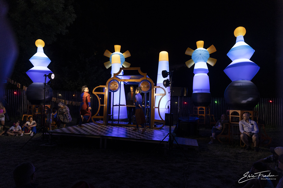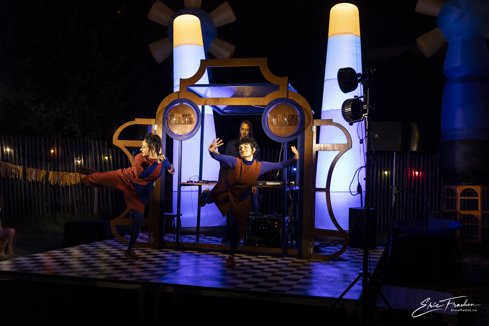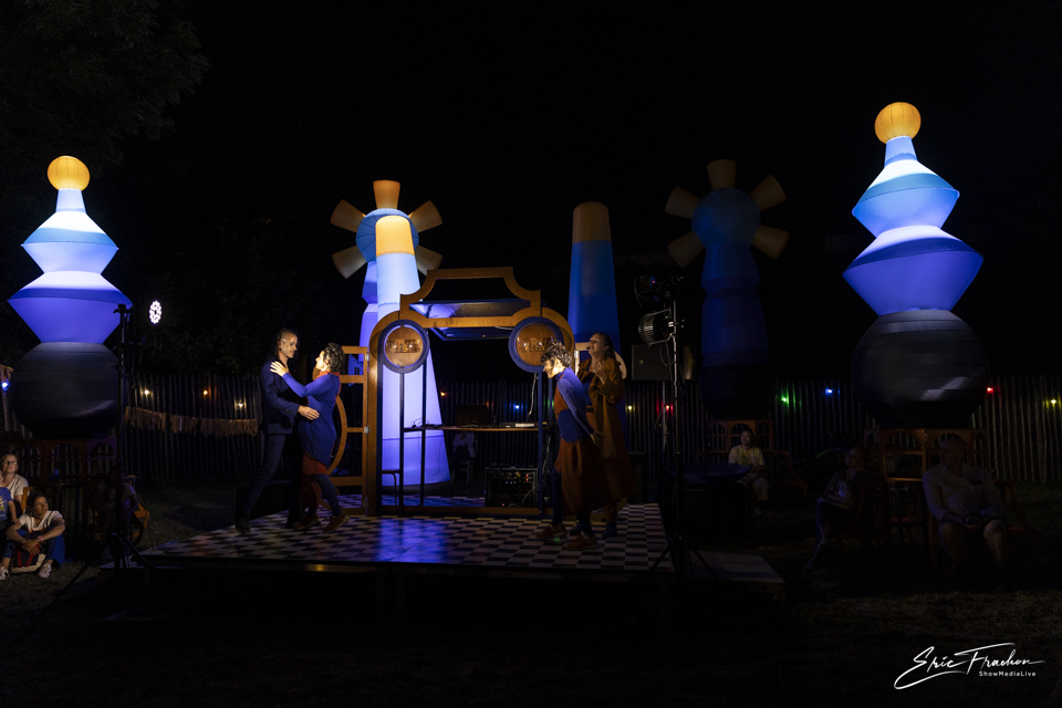 Live pictotek un spectacle de quatre danseurs qui se produit au milieu d’un parc, entourés de grandes statues gonflables qui présente un show.
