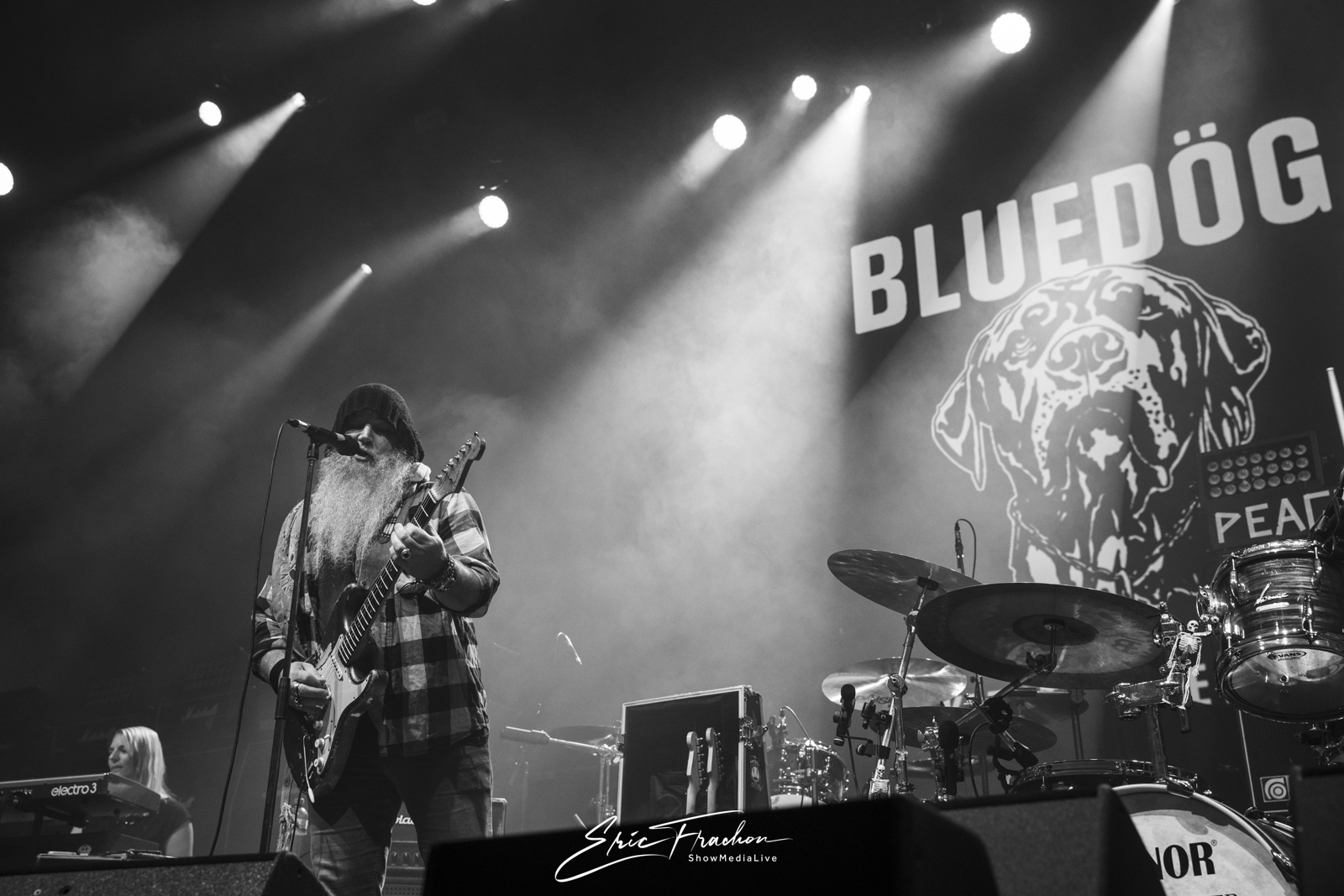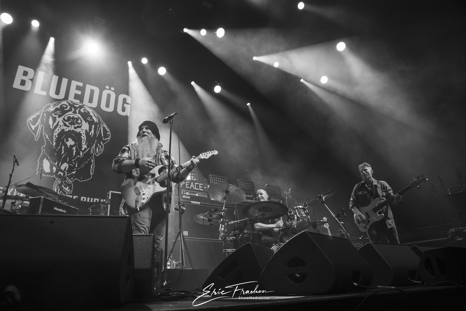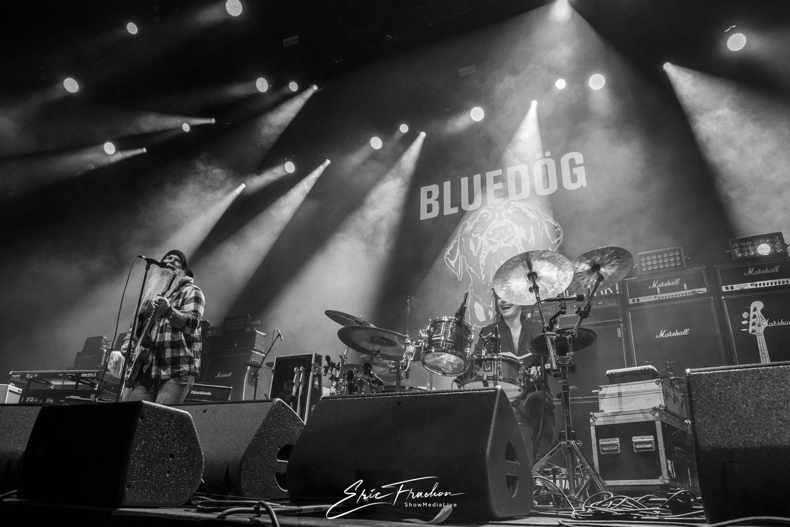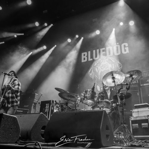 La soirée débute avec Bluedög, en toute première partie. Groupe suisse relativement récent, Bluedög s’inscrit dans la scène hard rock / rock alternatif, avec de fortes influences issues du rock des années 70 à 90.